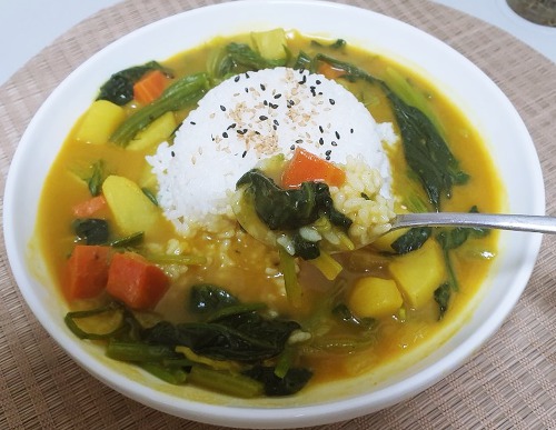 시금치 카레라고 해서 시금치 풋내가 생각나 맛이 이상할 줄 알았는데 시금치가 카레에 들어가니 이렇게나 맛이 좋을 줄 몰랐습니다. 카레에 들어간 시금치는 달콤하며 부드럽고 영양도 좋습니다.