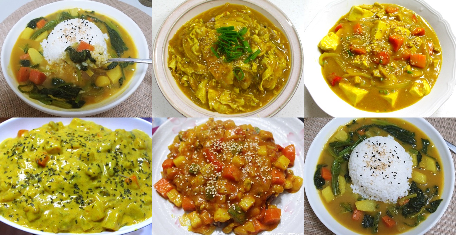 오늘 소개해 드릴 5가지 카레 종류는 1) 계란 카레 2) 방송에 소개되어 유명해진 시금치 카레 3) 두부 카레 4) 토마토 카레 5) 바나나 우유 카레입니다.