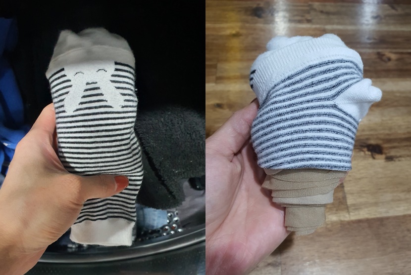 4. 그다음 세탁할 양말에 접은 스타킹을 쏘~옥 넣어주세요.