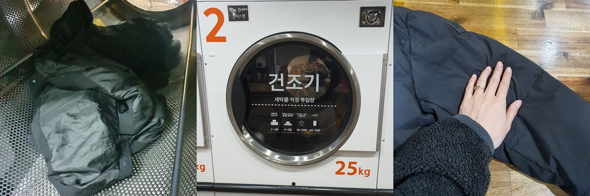 빨래방에 맡기는 경우 세탁비 4500원을 포함해 건조(500원에 3분, 세탁소마다 틀림)까지 하면 거의 세탁소에 맡기는 만원의 비용과 비슷합니다. 결과는 당연 세탁소에 맡기는 경우 완충제가 빵빵하게 또 옷이 깨끗하게 세탁이 되니 참으로 만족스럽습니다. 그리고 빨래방에 맡겨 건조까지 하는 경우 완충제 뭉침으로 옷의 숨도 죽고 모양도 안 나서 다시 세탁소에 맡기게 되는 참사를 겪기도 했습니다. 롱 패딩의 경우 집에서 물세탁 시 자연건조를 시키라고는 하나 제가 직접 경험해 본 결과 완충제가 뭉치면 옷걸이나 무거운 걸로 두드려도 잘 펴지지 않기 때문에 만족스러운 결과가 없었습니다.