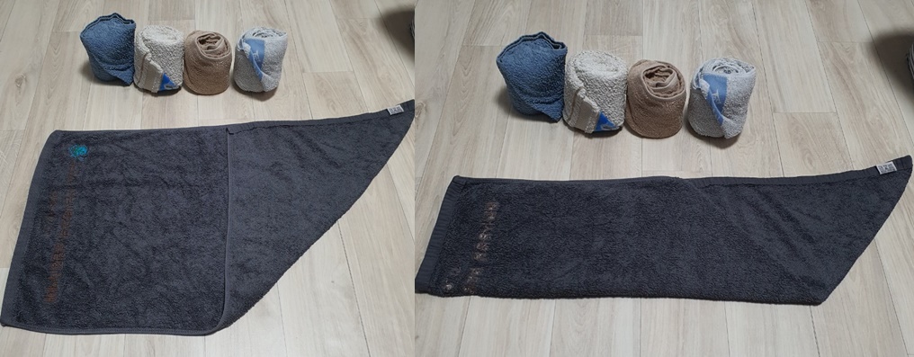 1) 수건을 우측 삼각형으로 접어줍니다.