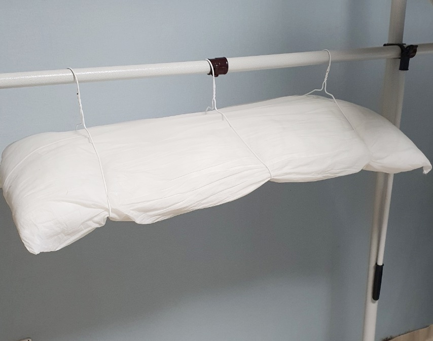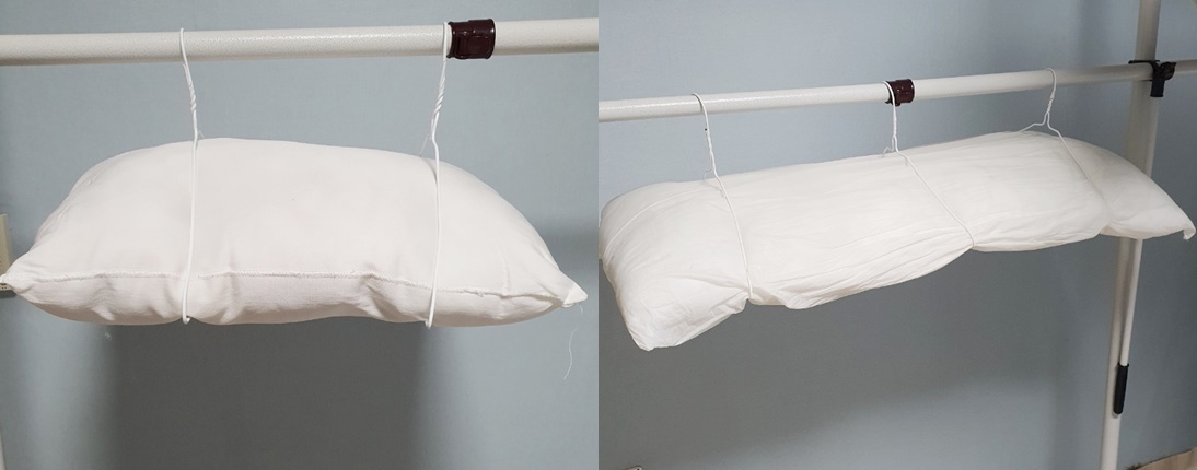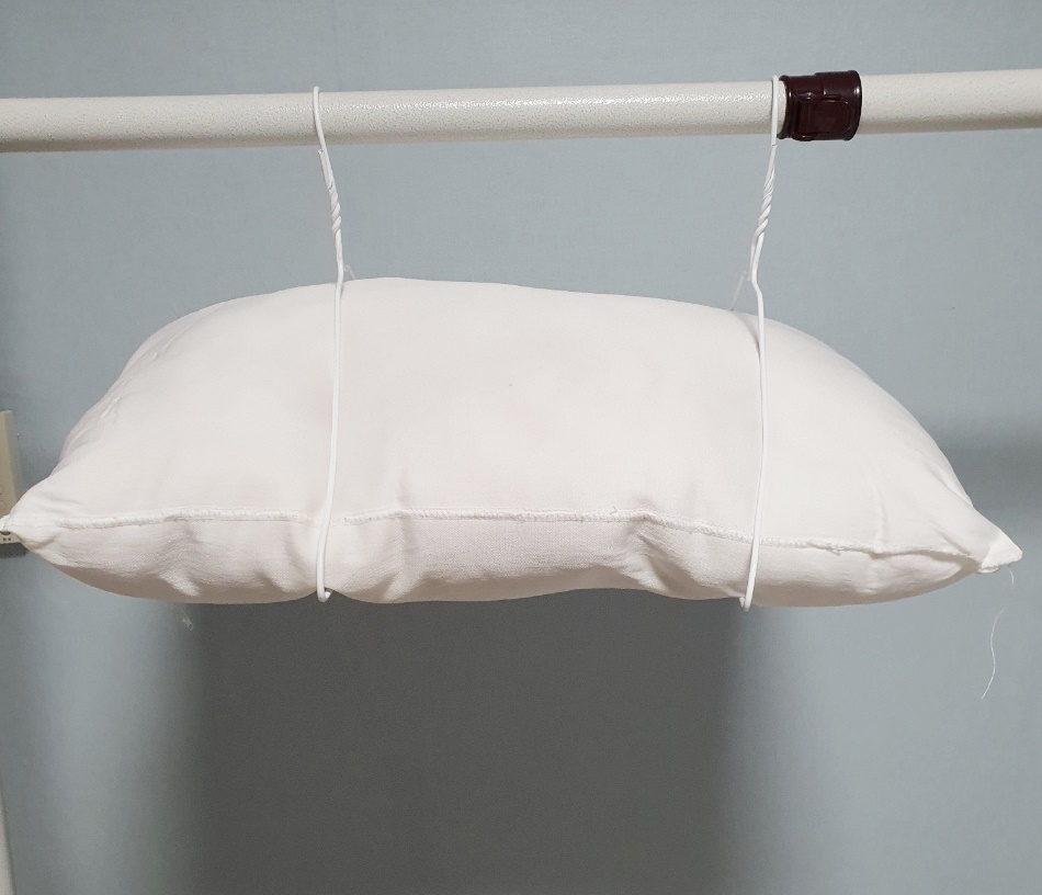 그리고 손으로 골고루 베개솜을 팡팡 두드려 준 후 옷걸이 두 개를 사용하여 평평하게 널어주세요.