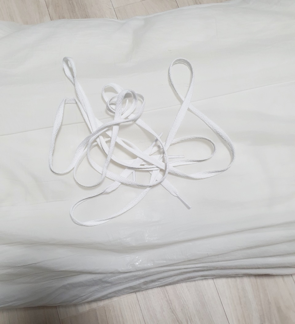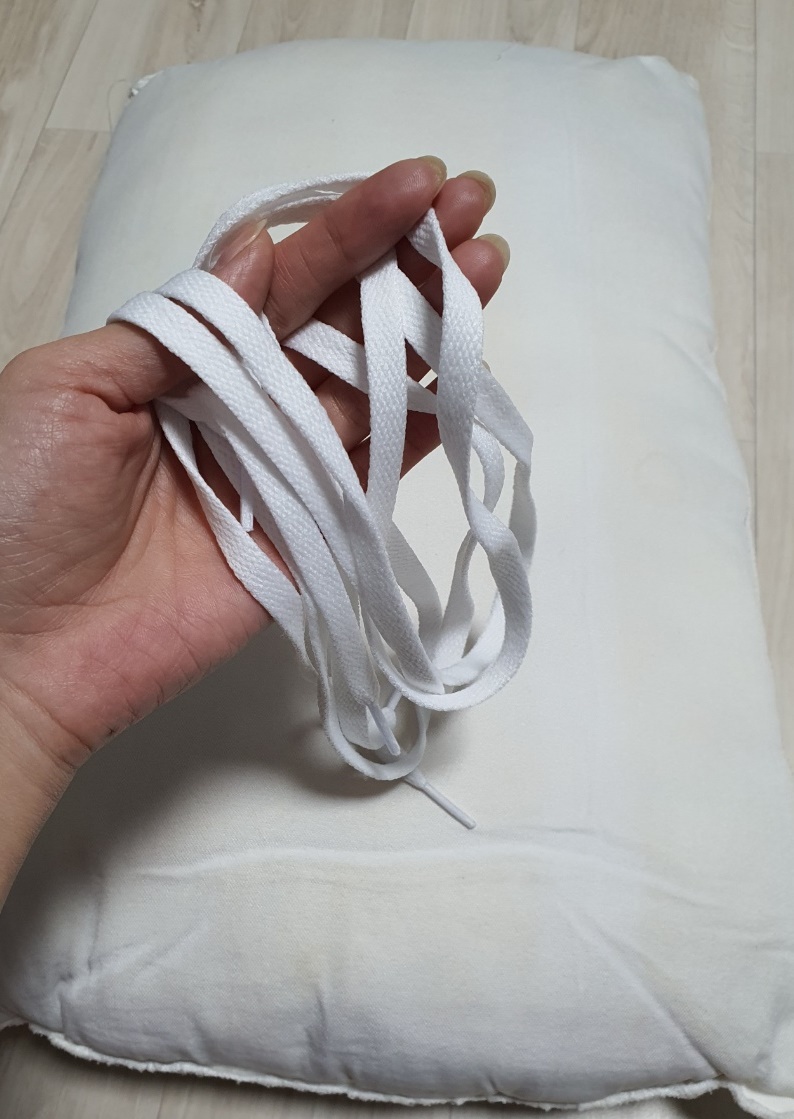 집에 운동화 끈이 없다면 다이소에서 천 원에 구입 가능하며 색이 있는 운동화 끈은 베개솜에 물이 들 수 있으니 피해 주세요