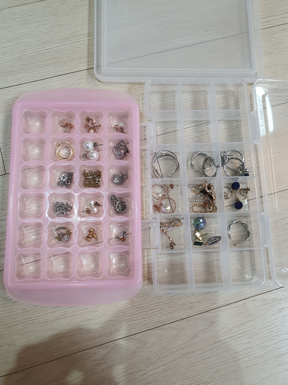 목걸이나 작은 액세서리는 얼음틀에 담았고 큰 귀걸이는 큰 수납함에 담았어요.