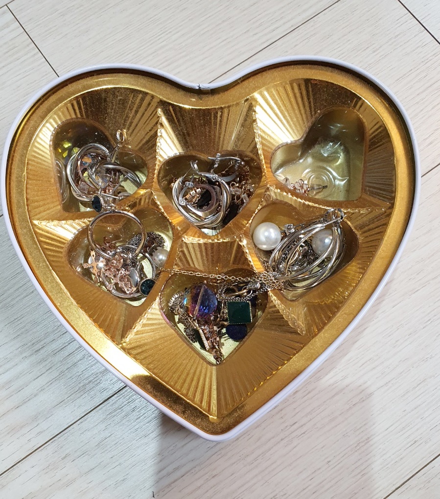 보기엔 예뻐 보였지만 사용하지 않는 악세사리가 워낙에 많아 자리만 차지한 터라 모두 다 정리를 해서 깔끔하게 버렸어요. 그러곤 하나 둘씩 사게 된 악세사리가 늘어나다 보니 먹었던 초콜렛통에 이렇게 한 개 두 개씩 넣어두게 되었는데요.