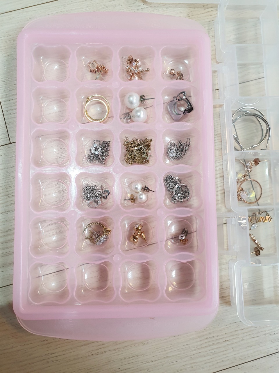 목걸이나 작은 액세서리는 얼음틀에 담았고 큰 귀걸이는 큰 수납함에 담았어요.
