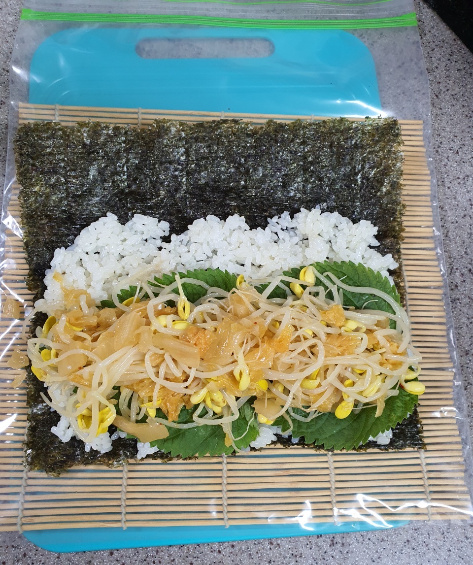 재료: 콩나물 한 봉, 깻잎, 김밥용 김, 신김치 잎 3~4장