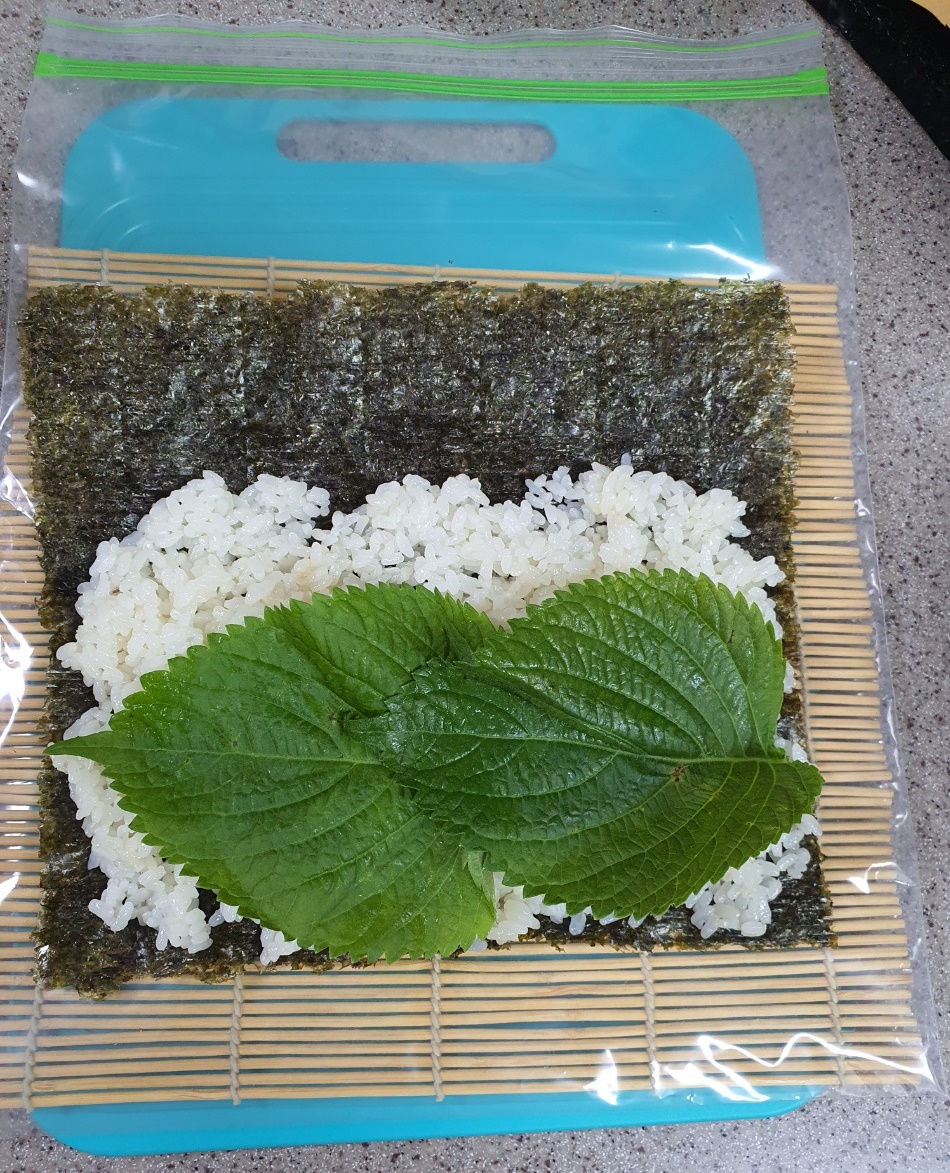 김밥용 김을 깔고 밥을 펼친 후 깻잎을 올려주세요~