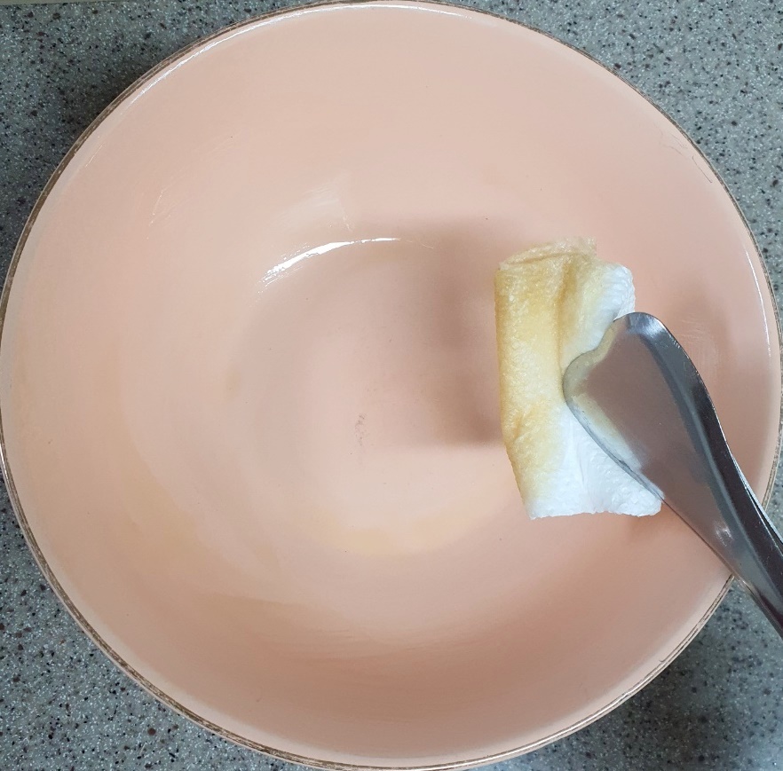 그리고 계란찜을 할 그릇에 참기름 한 큰 술 넣은 후 키친타월로 고루 코팅하고요~