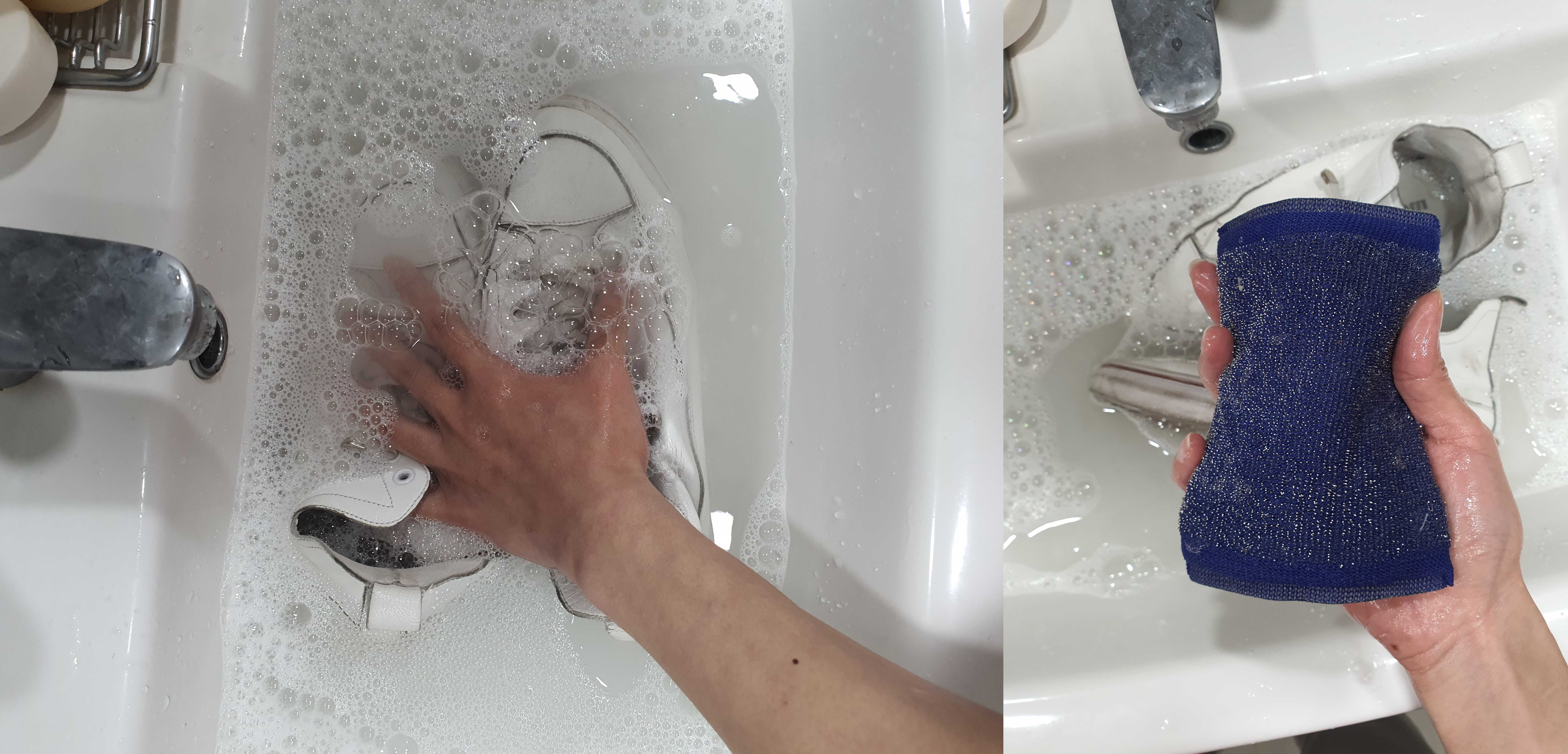 3) 그리고 운동화를 세제 물에 담근 다음 운동화 테두리를 수세미로 문질러주세요.