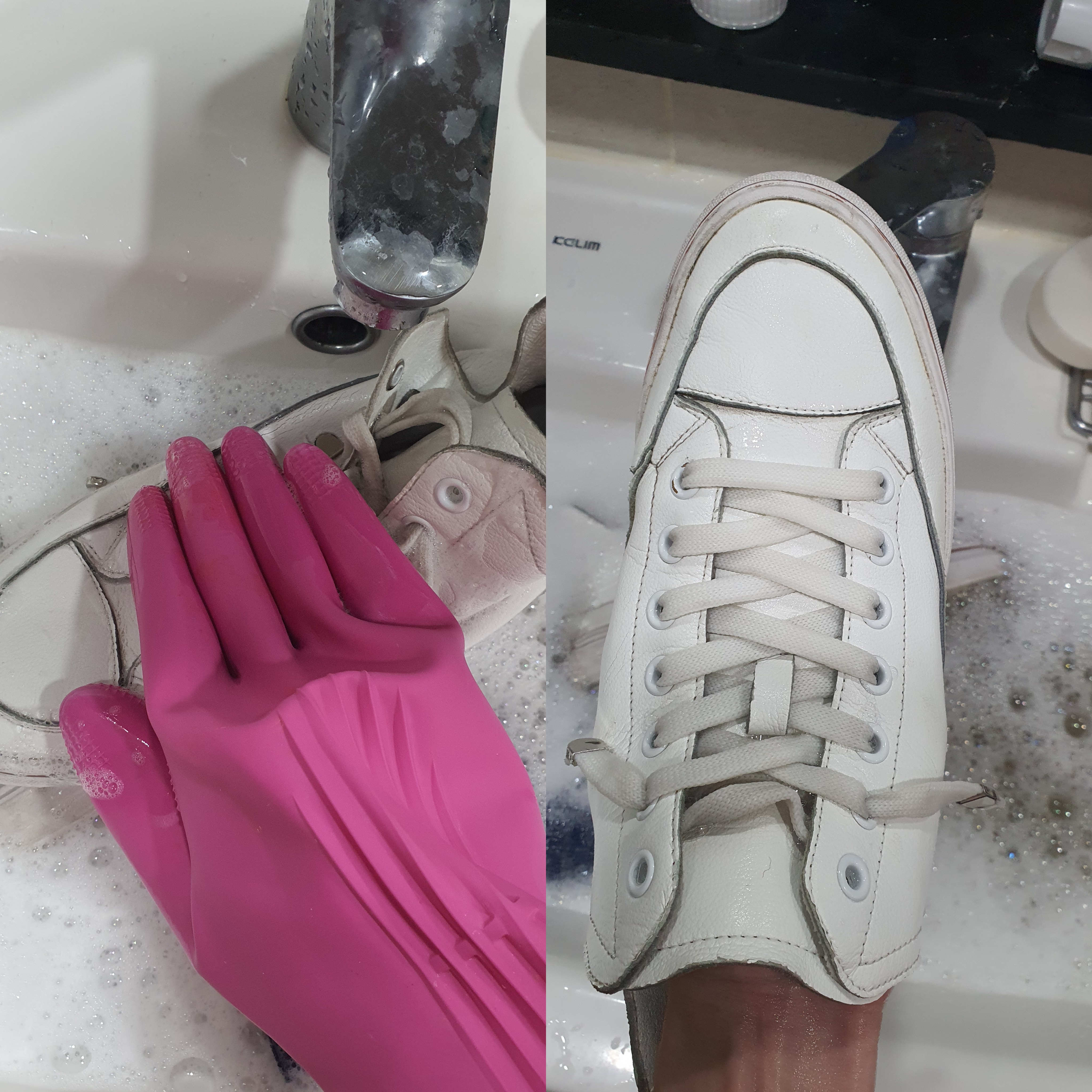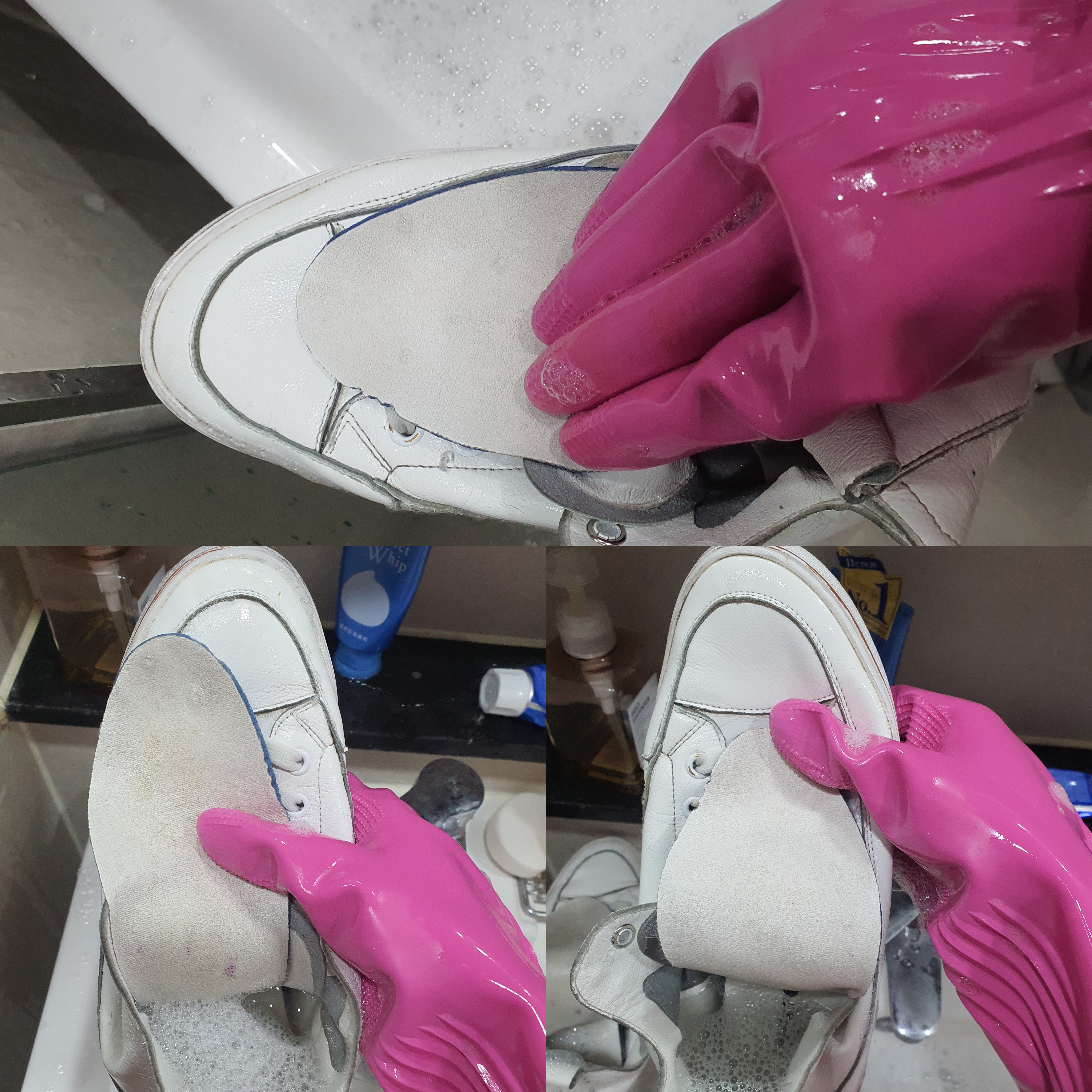 4) 그리고 고무장갑의 오돌토돌한 아랫면을 사용해 신발 윗부분을 문질러주면 금세 신발 윗부분도 이렇게 깨끗해지는데요. 큰 힘 들이지 않고 몇 번만 문질러줘도 금세 깨끗해집니다.