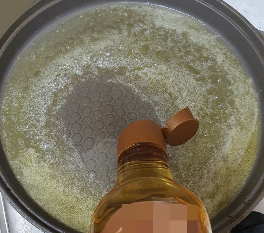그리고 팬에 기름이 예열되면 반죽을 젓가락을 사용해 조금 떨어뜨려 보세요.