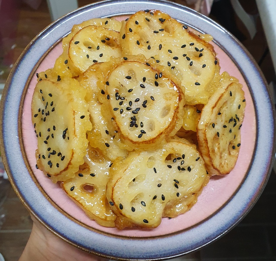 그리고 마지막으로 검은깨를 솔솔 뿌려주면 고소하고 달콤한 허니버터 연근칩 완성입니다.