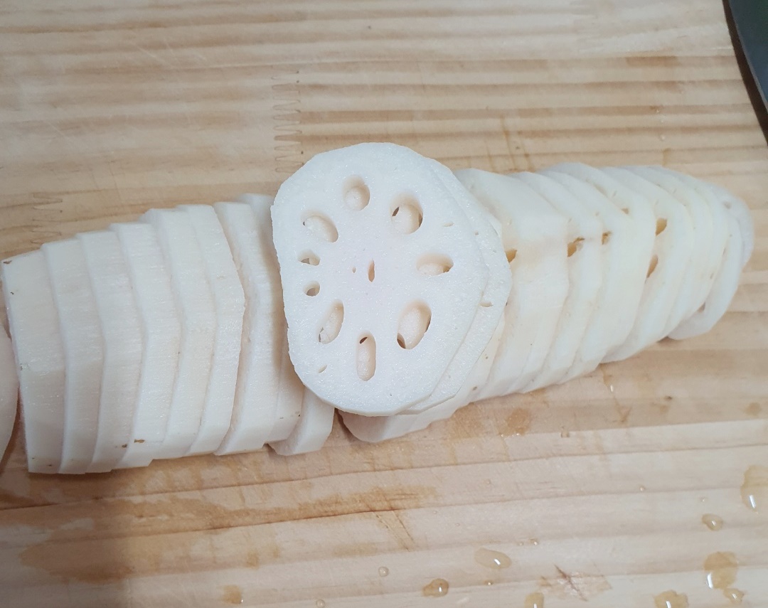 그리고 한 입 크기로 썰어 연근을 물에 씻어 전분기를 빼 준 후 채반에 받쳐 물기를 빼 주고요.