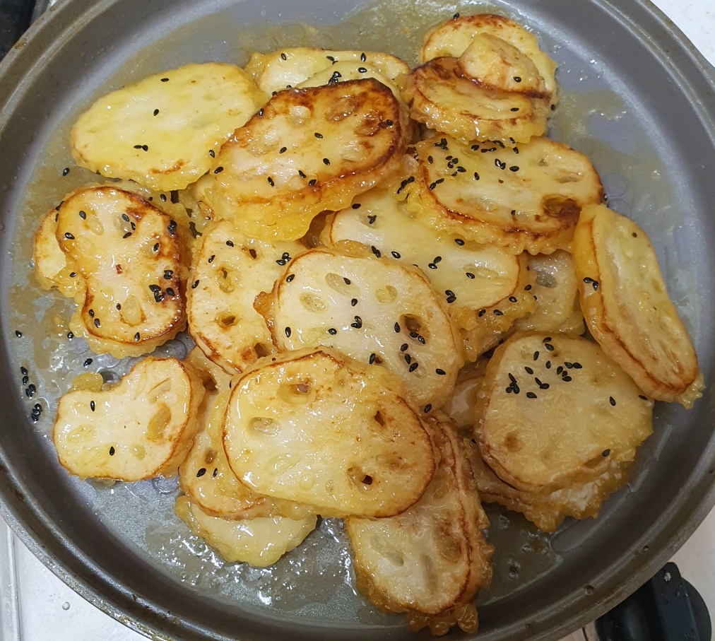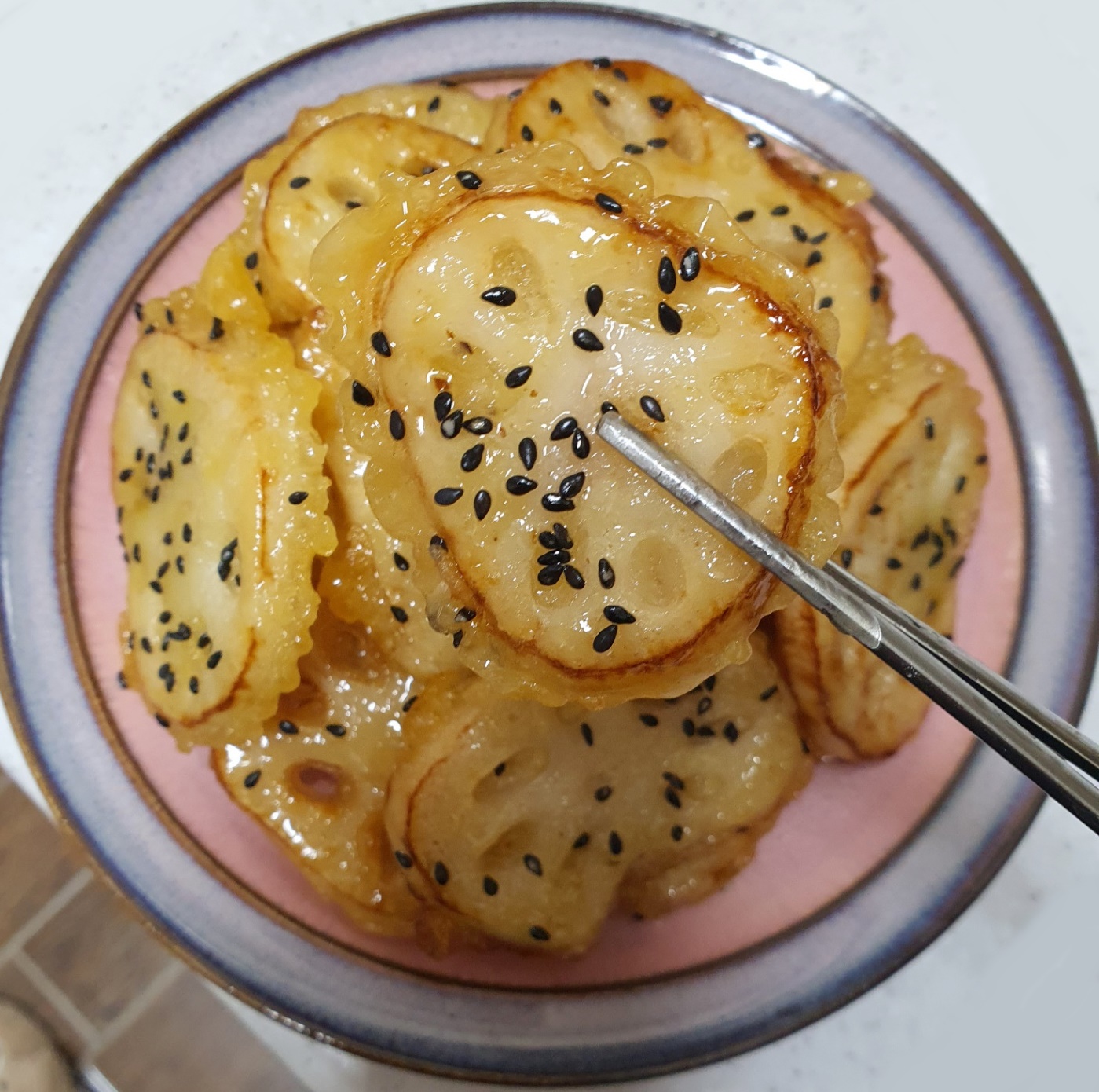 그리고 마지막으로 검은깨를 솔솔 뿌려주면 고소하고 달콤한 허니버터 연근칩 완성입니다.