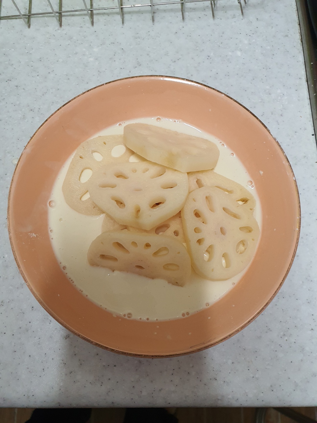 2. 튀김가루와 옥수수 or 감자 전분가루를 5:5 비율로 섞어 연근을 가루에 묻혀 털어낸 후 튀겨낸다.
