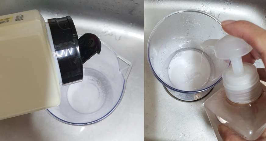 1) 빈 용기에 과탄산소다 한 큰 술, 주방세제 조금 넣어주세요.