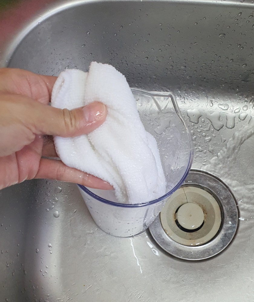 2) 그리고 물을 부어준 다음 행주를 바로 담가주시는데요.