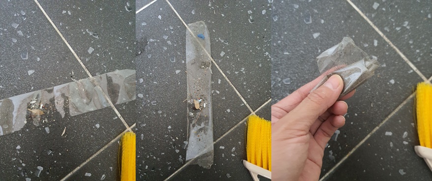 이럴 때는 테이프를 사용해서 빗자루로 바닥을 쓸어보세요.