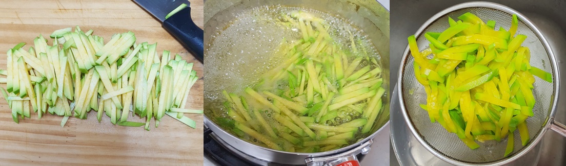 당근 데친 물은 버리지 않고 그대로 애호박, 어묵 순으로 데쳐냅니다.
