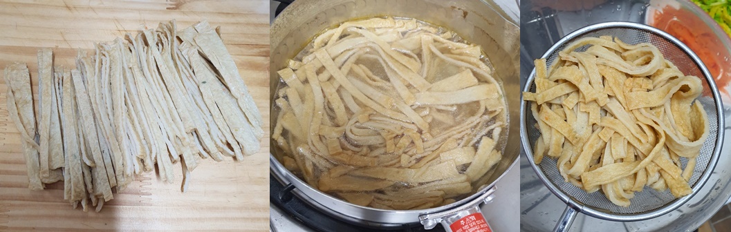 그리고 채 썬 어묵도 살짝 데쳐내어 찬물에 씻어 기름기를 빼 주고요.