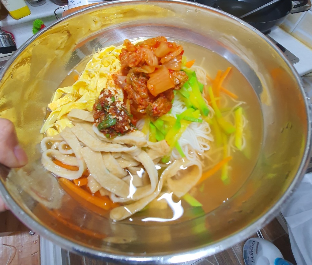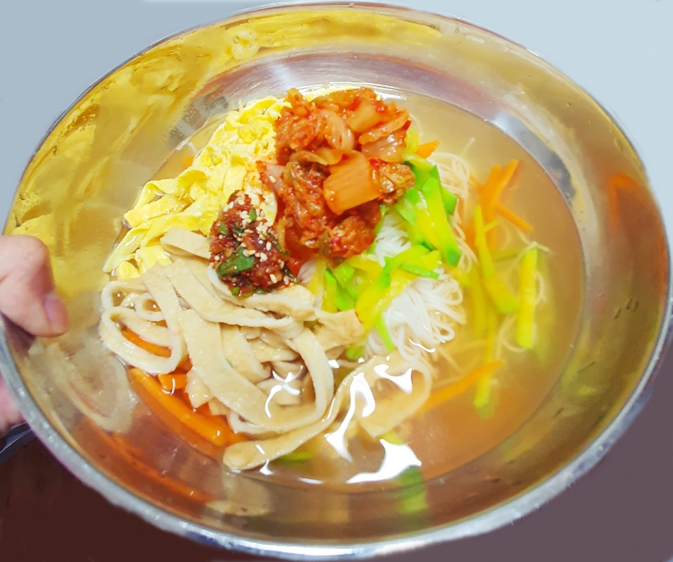 그리고 국수를 먼저 그릇에 담은 다음 육수를 부어주고 준비한 야채와 양념장을 올려 드세요^^