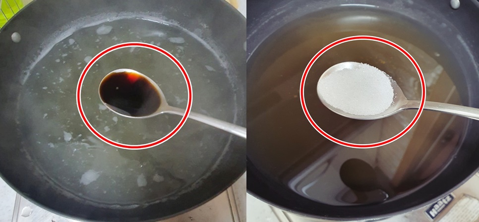 국간장 2개, 설탕 반 티 넣어 주세요. (맛을 보시고 가감하세요.)