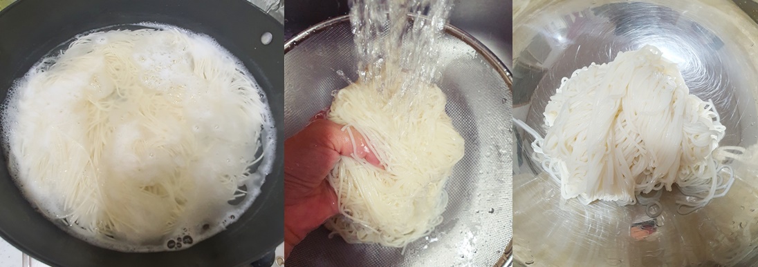 3번째 물이끓어 오를 때 국수를 건져내어 찬물에 비벼서 전분기를 빼 줍니다.