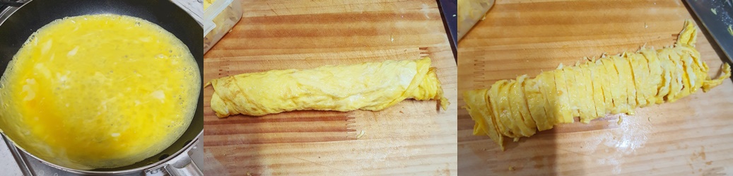 그다음 계란 지단을 얇게 만들어 도마에 펼쳐서 식혔다가..
