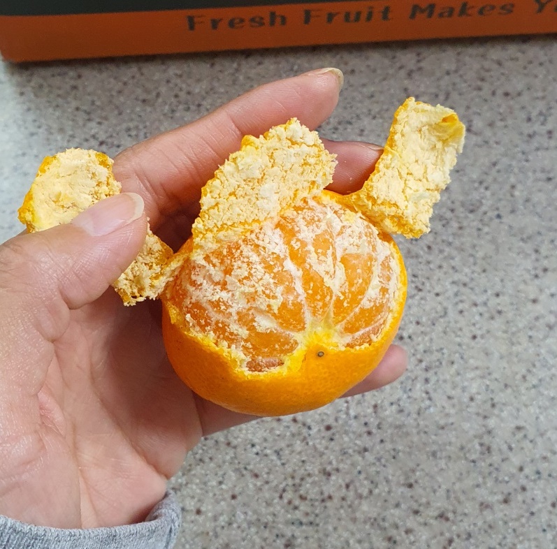 과즙이 터지지 않는 귤을 먹어보니 신맛이 떨어지면서 냉랭한 단맛이 나며 질겼습니다.