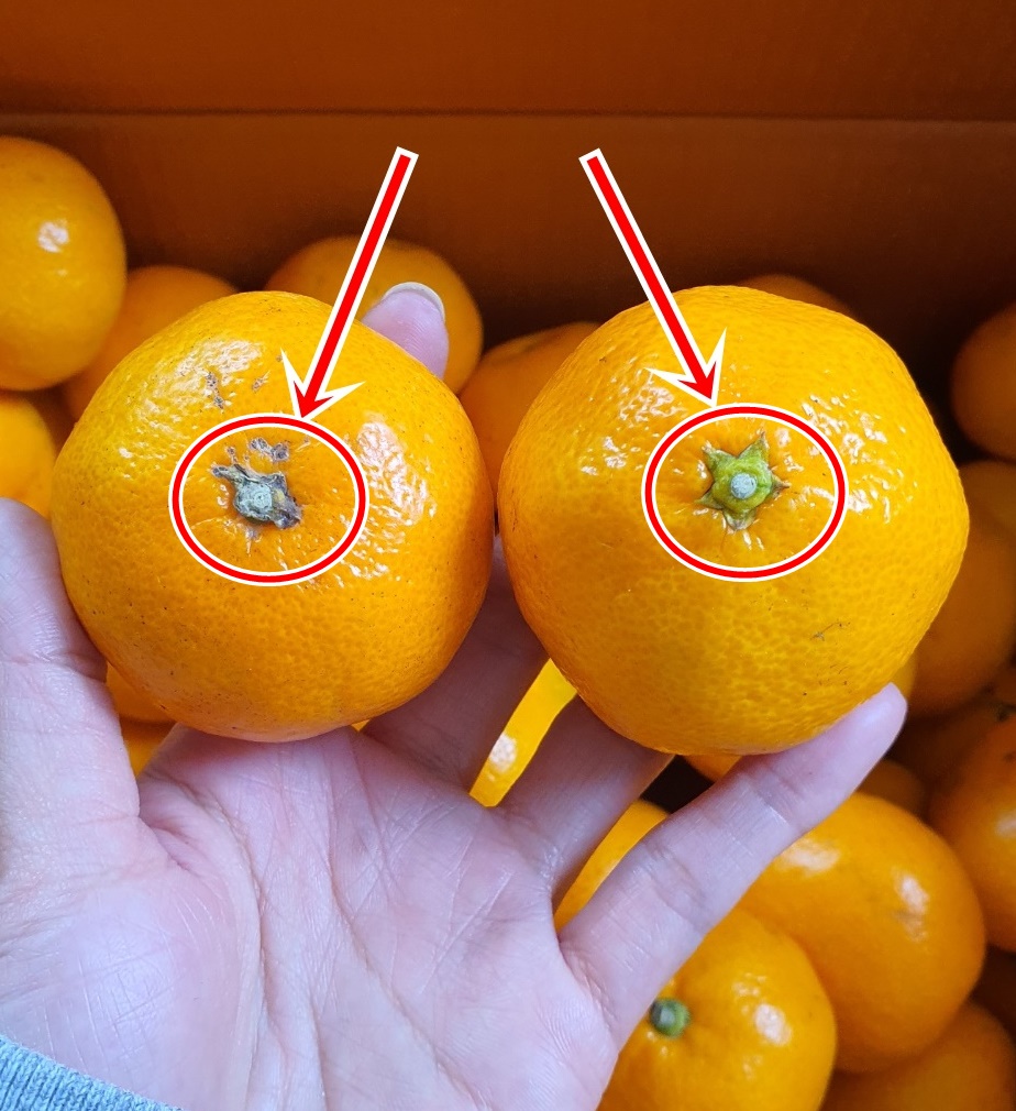 꼭지가 말라버린 귤은 수분이 많이 빠져있고 맛이 질깁니다.