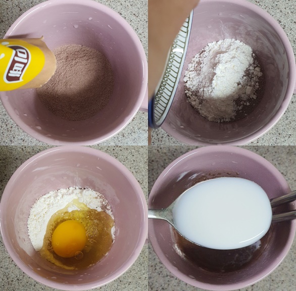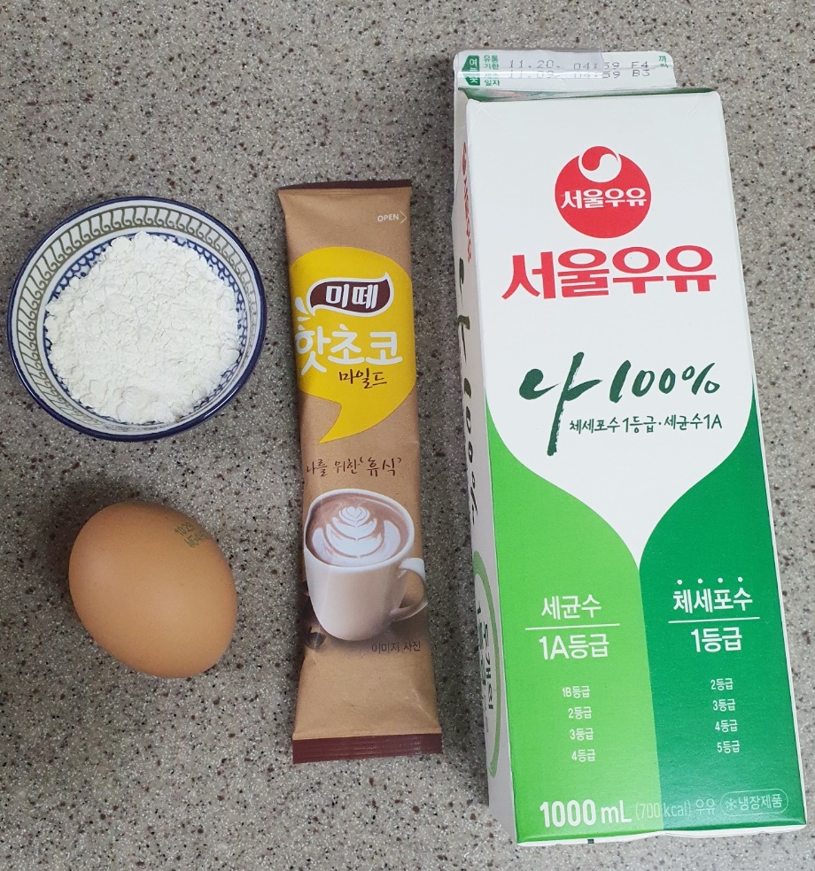 핫초코 봉지 1개, 계란 1개, 밀가루 1숟가락, 우유 1숟가락입니다.