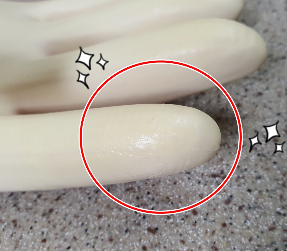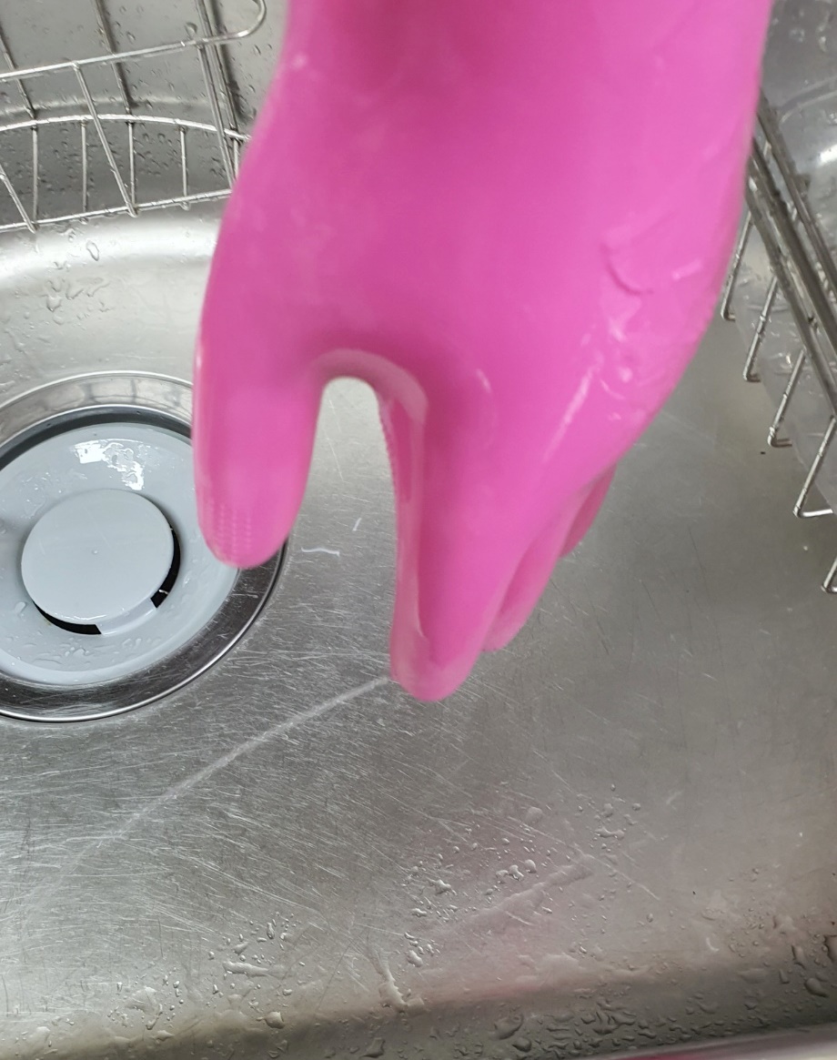 고무장갑에 물이 들어와서 보니 구멍이 생긴 상태입니다.
