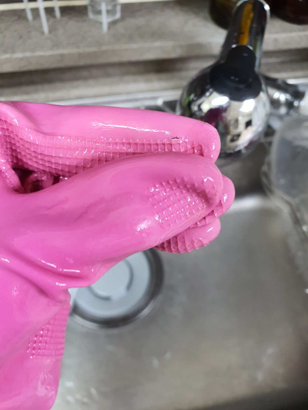 고무장갑에 물이 들어와서 보니 구멍이 생긴 상태입니다.