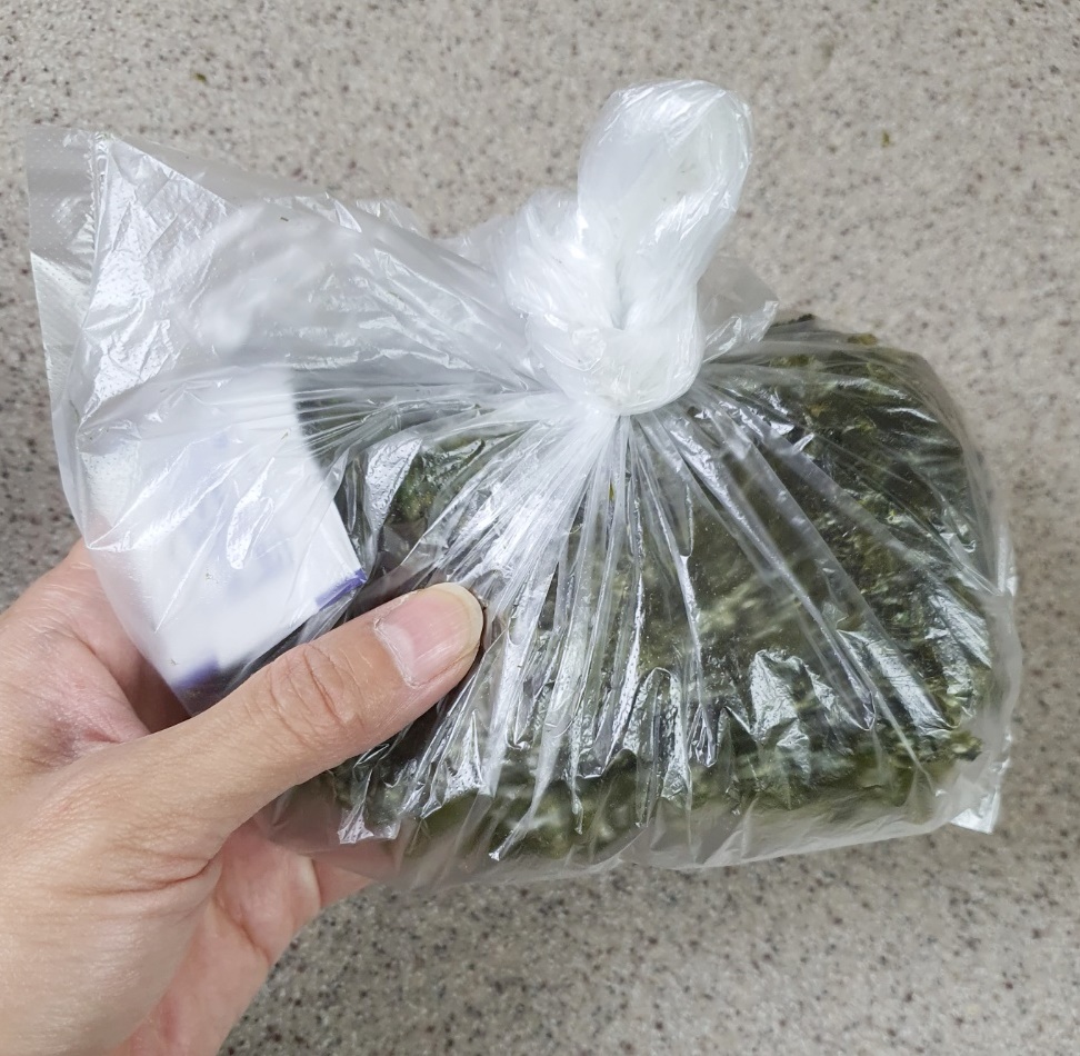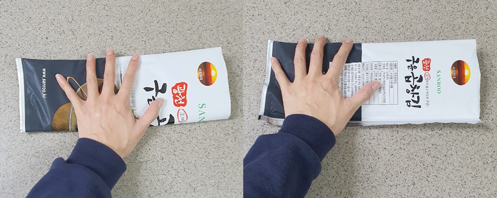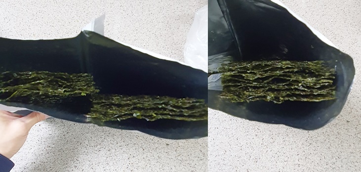 봉지를 세로로 세워 안에 든 김이 아래로 모두 향하도록 2~3번 털어줍니다.