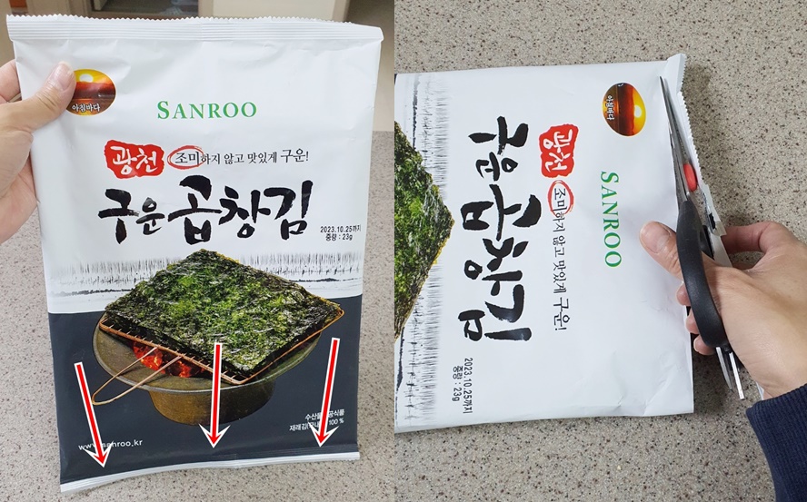 그리고 반찬통이나 비닐에 대고 김을 가위로 꺼내 줍니다.