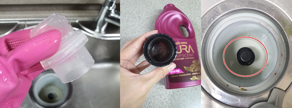 액상으로 된 섬유유연제와 세탁 세제 뚜껑은 크기가 모두 동일한데요.