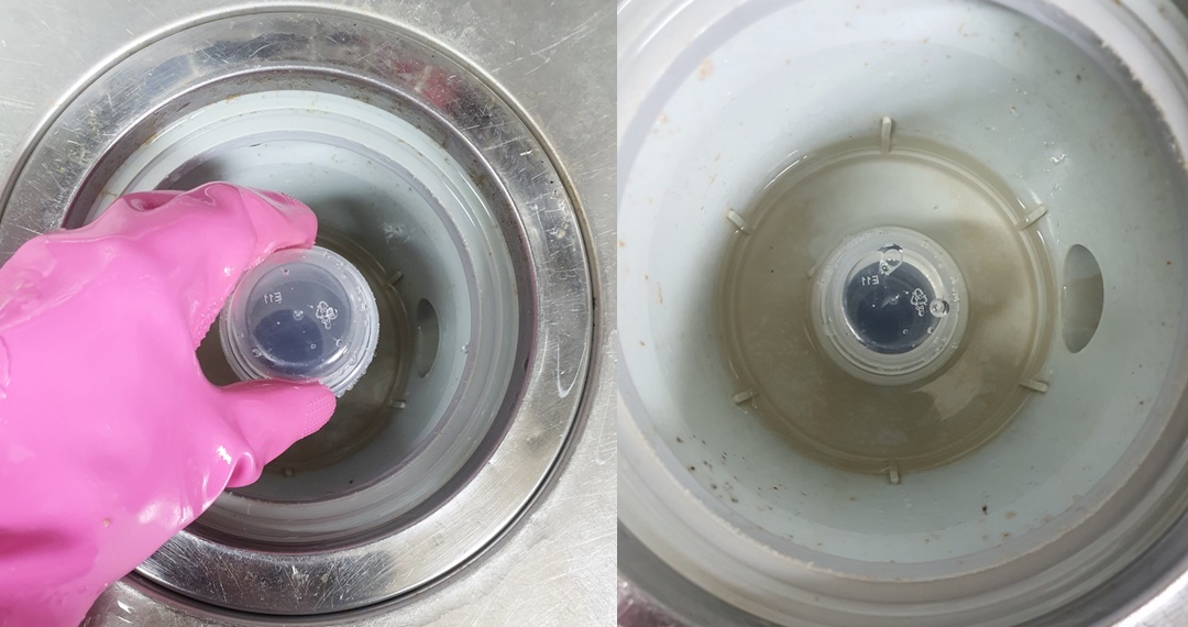 세제 뚜껑을 하수구 내려가는 곳에 꽂아주세요.