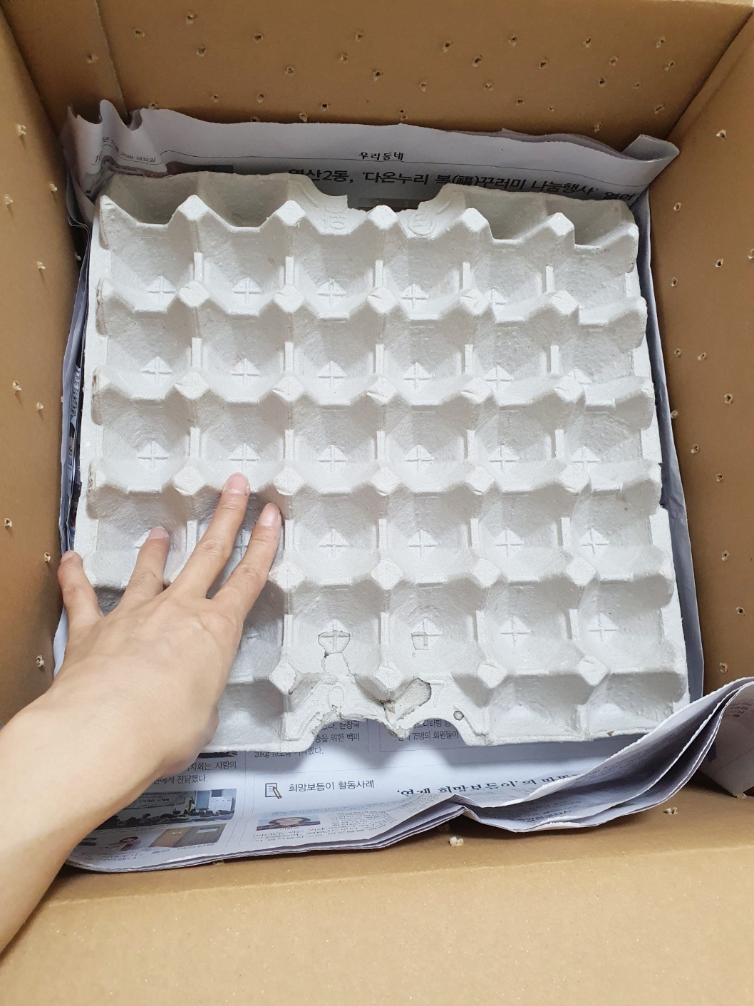 바닥에 신발 박스 놓고 그 위에 고구마 박스를 올려주세요.