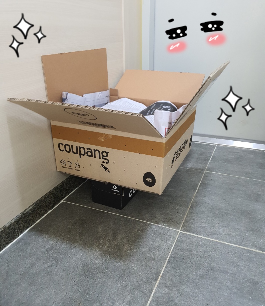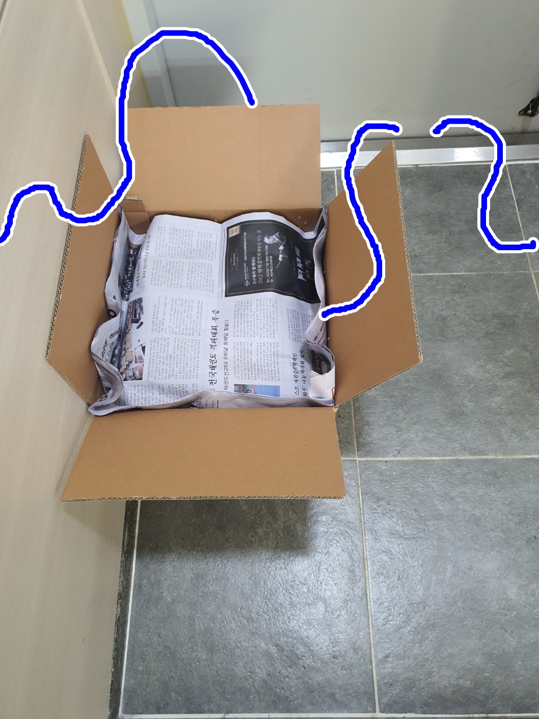 바닥에 신발 박스 놓고 그 위에 고구마 박스를 올려주세요.