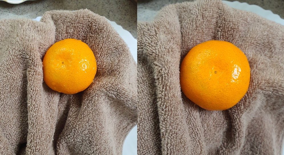 그다음 귤에 묻은 물기를 수건으로 닦아주세요.
