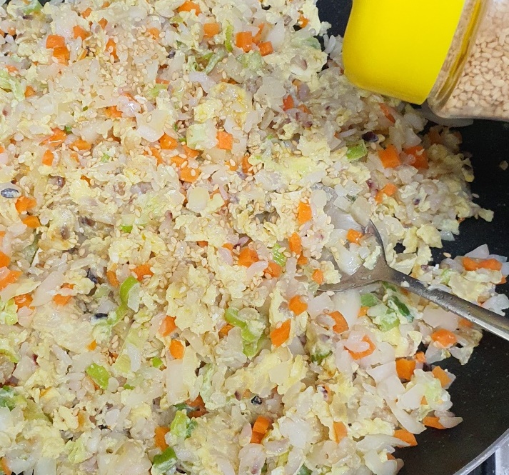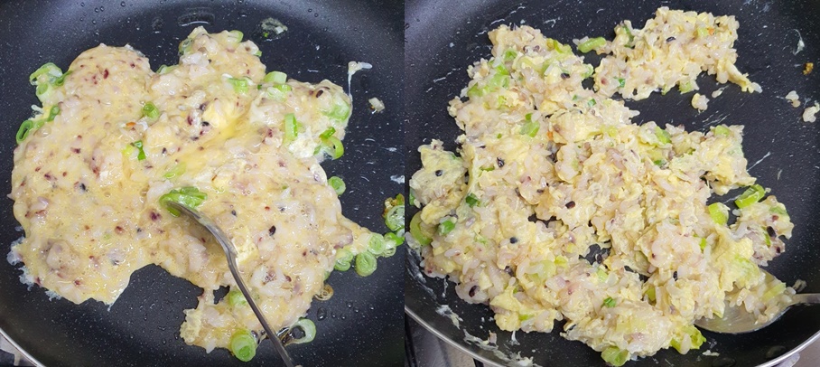 밥을 뒤집어가며 계란을 익혀주세요.