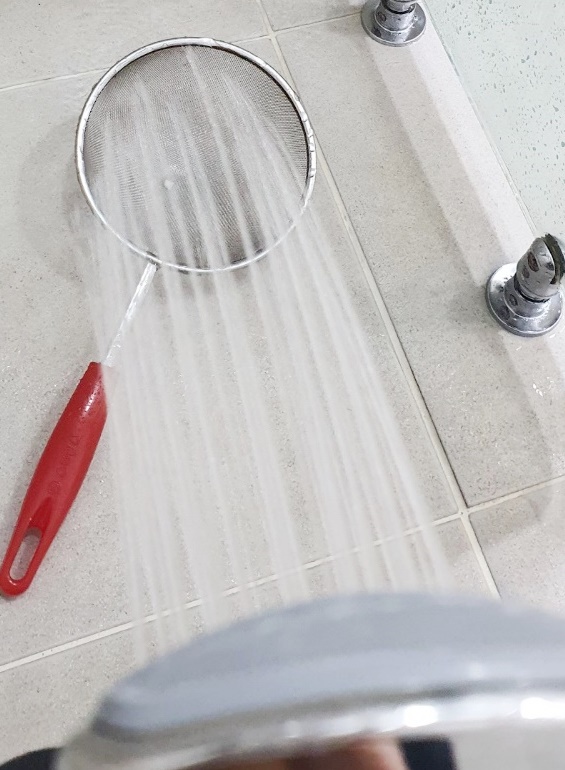 샤워기 물을 틀어놓고 체망에 그냥 넣어주세요.
