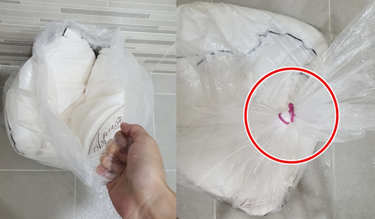 이때 비닐 안에 공기를 빼 내고 고무줄을 3~4번 묶어주세요.