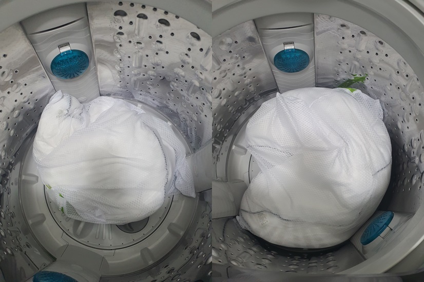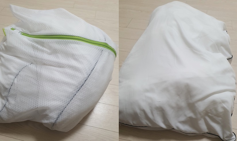 솜까지 심하게 뭉치기 때문에 세탁기로 베개솜을 세탁하는 것은 올바른 세탁 방법이 아닙니다.