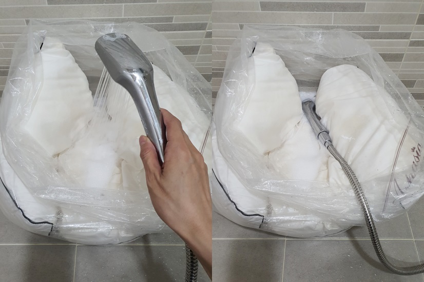 9. 베개솜을 세탁망에 넣어 눌러서 물기를 빼 준 다음