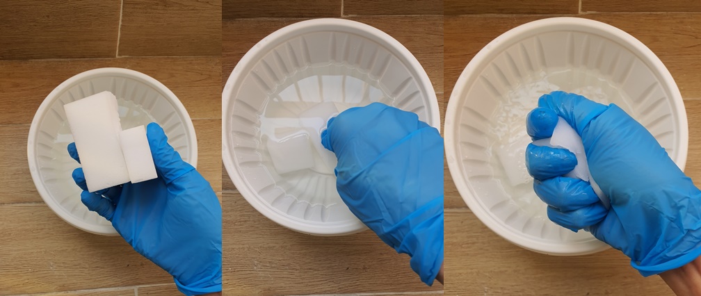 그리고 매직블록을 물에 담근 다음 물기를 짜 주세요.