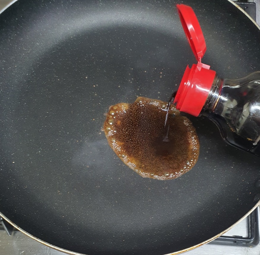 진간장을 프라이팬 전체적으로 펴줍니다.