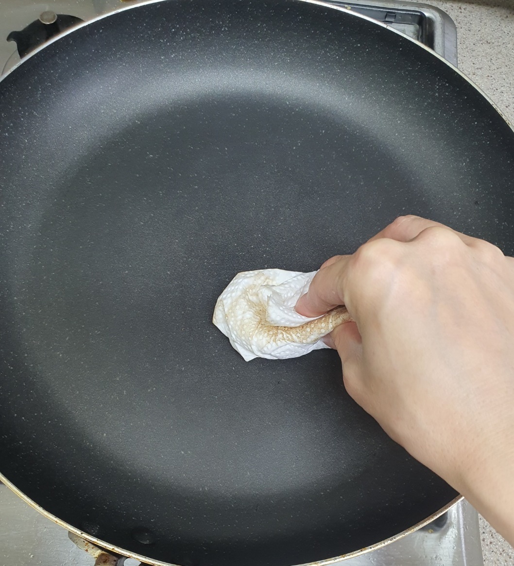 1. 생선을 구운 프라이팬은 키친타월로 기름기를 닦아냅니다.