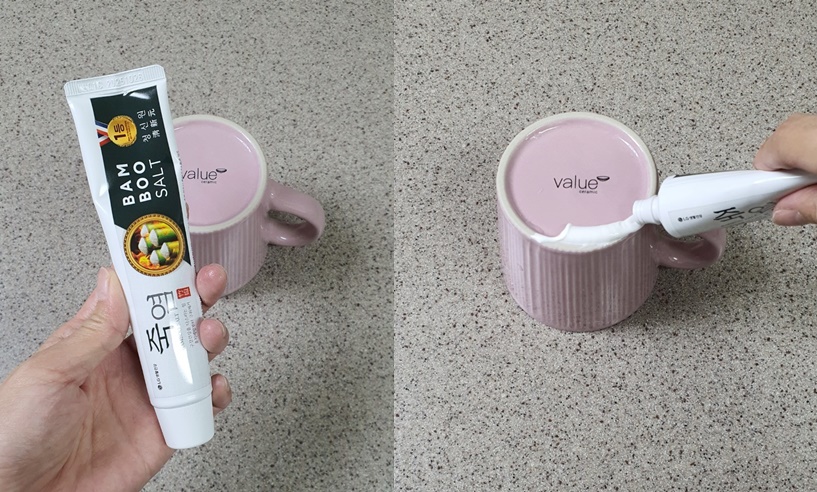 2. 치약을 머그컵 윗부분에 발라주세요.